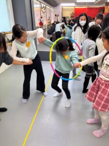 チーム全員で輪を作り、フラフープをくぐって繋いでいくスピード対決をしました。