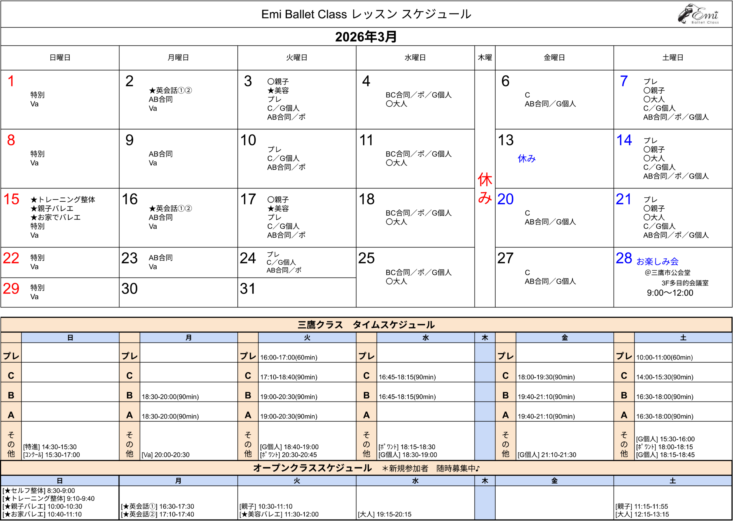 2025年 2026年 お知らせ 三鷹クラス26年3月スケジュール オープンクラス(親子バレエ、美容エクササイズ、大人バレエ)随時参加承っております。 ~~3月の予定~~ 13日(金) お休み 28日(土) お楽しみ会 30日(月)、31日(火) 振替予備日