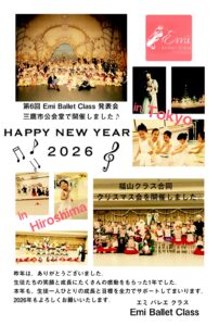 2025年 2026年 ブログ 2026年 Happy NEW year 昨年は、ありがとうございました。2025年は、三鷹市公会堂でお楽しみ会や第6回発表会を開催しました。福山市のクラスでは、合同クリスマス会を開催しました。 生徒たちの笑顔と成長にたくさんの感動をもらった1年でした。 本年も、生徒一人ひとりの成長と目標を全力でサポートしてまいります。 2026年もよろしくお願いいたします。 Emi Ballet Class